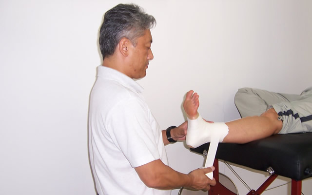この動画はスポーツの現場で外傷の予防、再発防止の目的で使われる足関節の基本的なテーピングです。