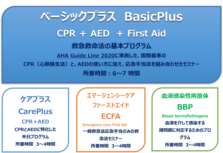 AHA Guide Line 2020に準拠した、国際基準のCPR(心肺蘇生法)と、AEDの使い方に加え、応急手当法を組み合わせたセミナー。